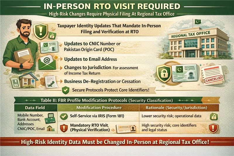 | CNIC/POC, Email Address, Jurisdiction, Deregistration | Mandatory RTO Visit (Physical Verification) | High security risk; core identifiers and legal status. |