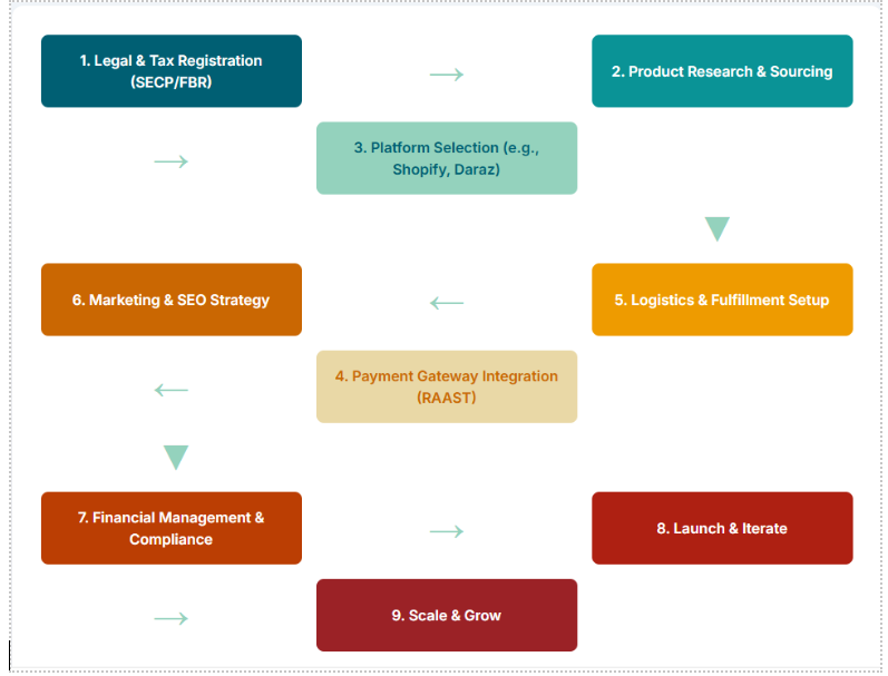 The first thing is to get your business registered. That means an NTN, and if sales tax applies, an STN from the FBR. It does not matter if it is you or a private limited company, this makes it official. And with e-invoicing now, you must link invoices to the FBR system too. Sounds technical, but really it just means using proper accounting tools and knowing your numbers. Then comes the foundation: product and platform. You cannot skip this. Figure out what you are selling and where you will sell it. Do a bit of research. Source from local manufacturers, import products, or try dropshipping, all are fine options.